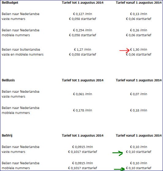 Daarnaast wijzigen de tarieven voor het bellen naar het buitenland: Tarieven BelBasis 2014 (pdf) en Tarieven BelVrij 2014 (pdf)